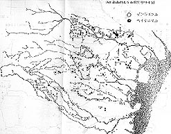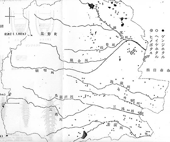 四日市市と菰野町のホタルがいる場所をプロットしてある地図を、四日市市史・菰野町史から引用し、掲載します。が、昔のですから、今では、その場所では見られない確率も高いです。ご注意ください。