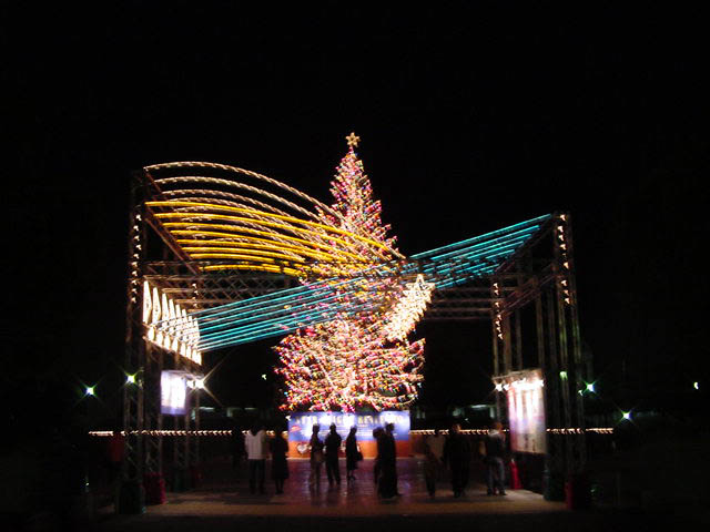 10mのもみの木に電球700個以上を取り付けた。